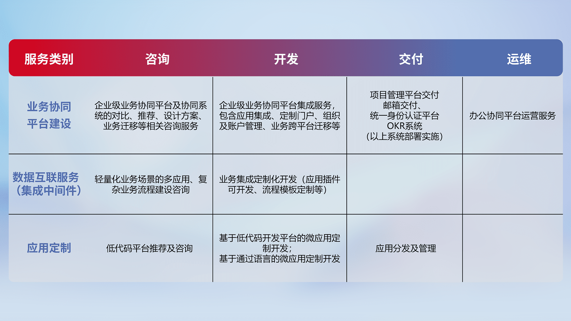 针对钉钉、、企微、、、、IDaas等平台级产品提供产品的规划、、、方案、、交付、、、、定制化开发等服务,,,实现如统一协同办公、、智能客户服务、、、混合会议管理、、智能数据查询、、、、等业务场景,,,,实现数字化转型。。