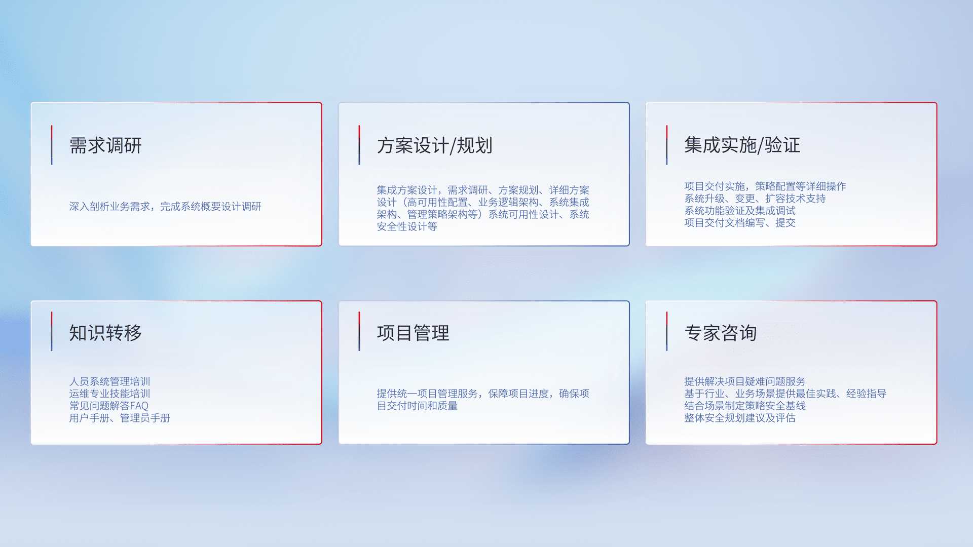 针对客户行业特性,,,,将宏观的安全战略和需求,,通过专业的交付服务,,,实现项目落地,,,,为客户提供标准规范的集成交付服务。。